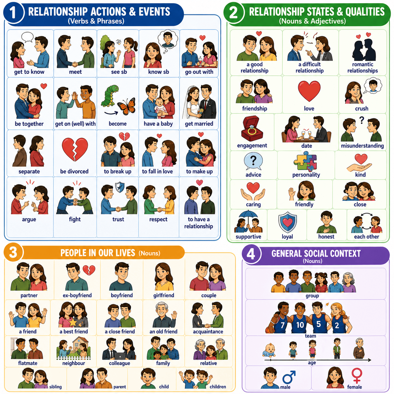 Отношения (Relationships) – это то, как мы знаем (know) и чувствуем других людей. У нас бывают разные отношения с разными людьми в нашей жизни.